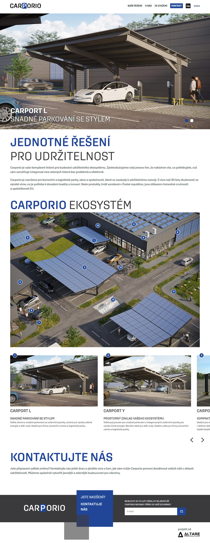 Carporio představuje nový projekt klienta, který nabízí služby v oblasti výstavby komplexních řešení tzv. carportů, což jsou speciální ekosystémy propojující zastřešená parkovací místa s výrobou solární energie. Cílem nového webu tedy bylo přehledným způsobem tato jednotlivá řešení představit.